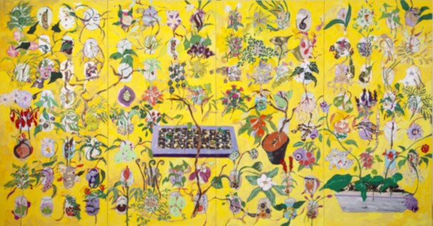 パネルに和紙、油彩、岩絵具、水干絵具 170×324cm |