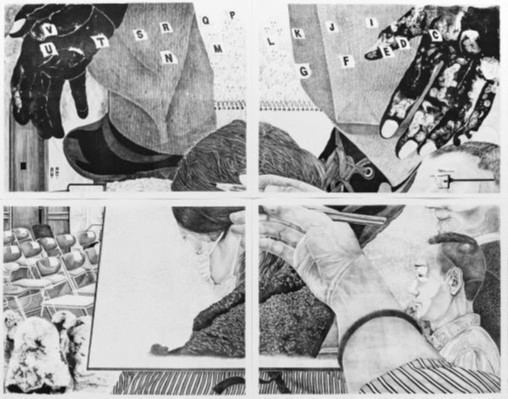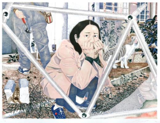 そこで得た経験や想像をもとにリトグラフ作品へと再構築する。事件の当事者の姿を自ら演じながら自画像にして作品に落とし込むことで、ニュースとその受け手の視線から生まれる重層的な「真実」を浮き彫りにする。
