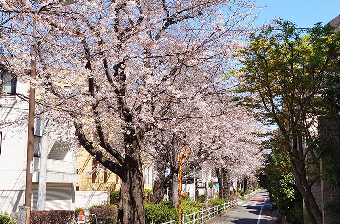 長く細く伸びる呑川柿の木坂支流緑道を、四季の移ろいに触れながら